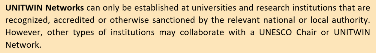UNESCO Chairs are established under the UNITWIN (University Twinning and Networking Programme) programme, with the aim of supporting research and educational development. The UNITWIN programme, which was launched in 1992 to support international cooperation between universities, has grown to approximately 1000 Chairs and 45 networks in 125 countries. This network of universities around the world supports UNESCO’s work, from exploring new challenges, to developing international normative instruments, to implementing policy recommendations at the national level. It acts as a bridge builder between academia, civil society, local communities, research, policy-making and UNESCO. |