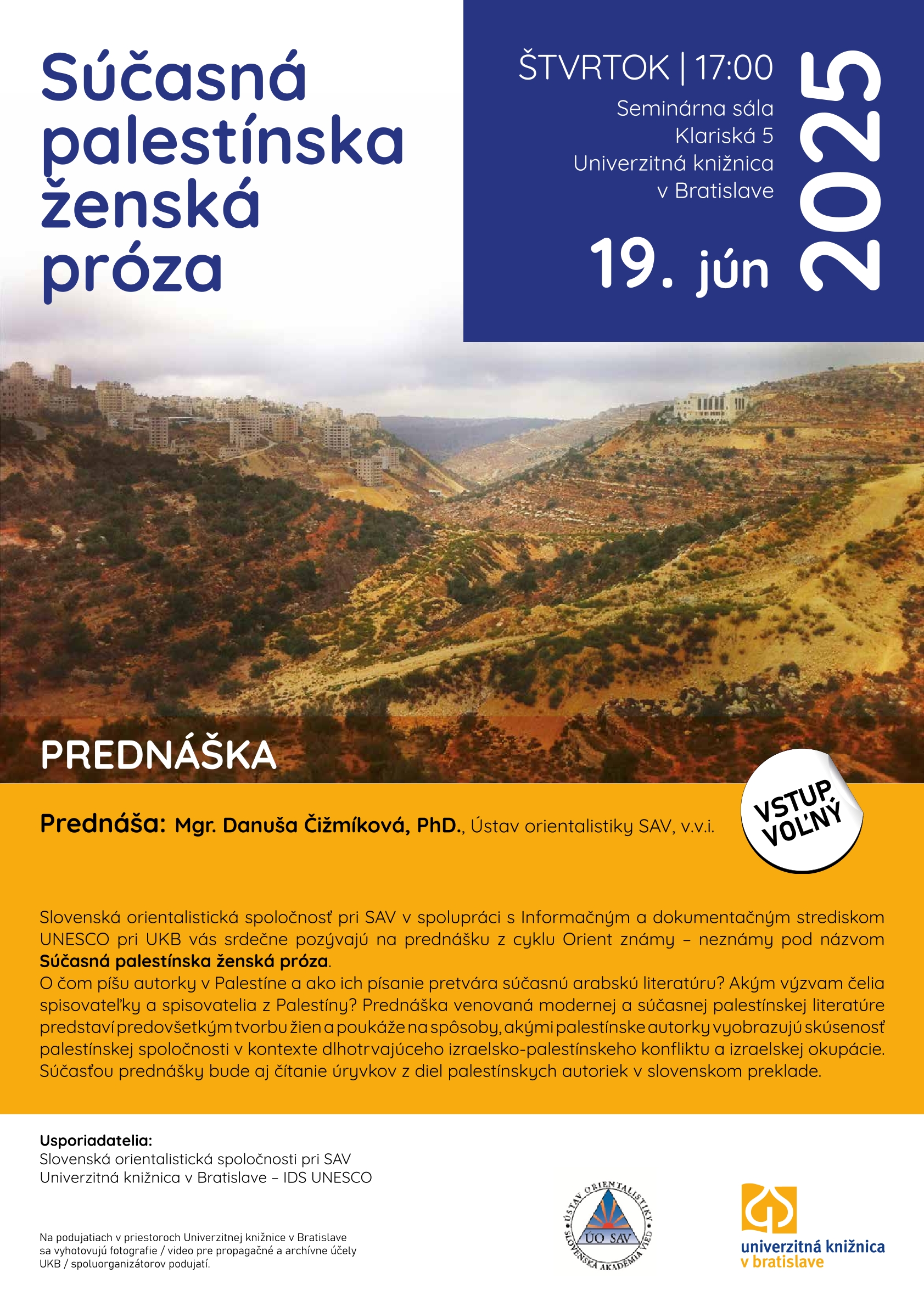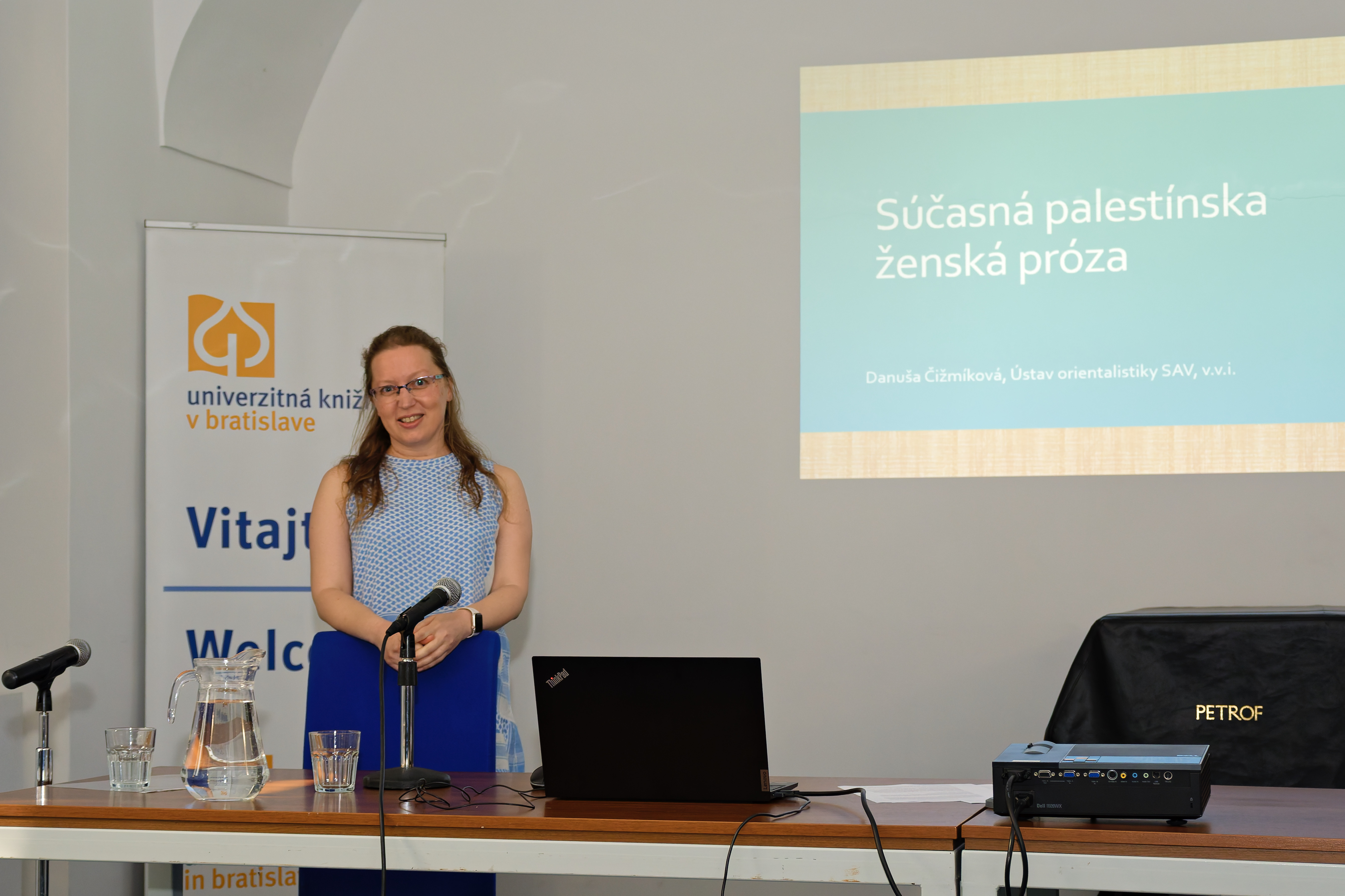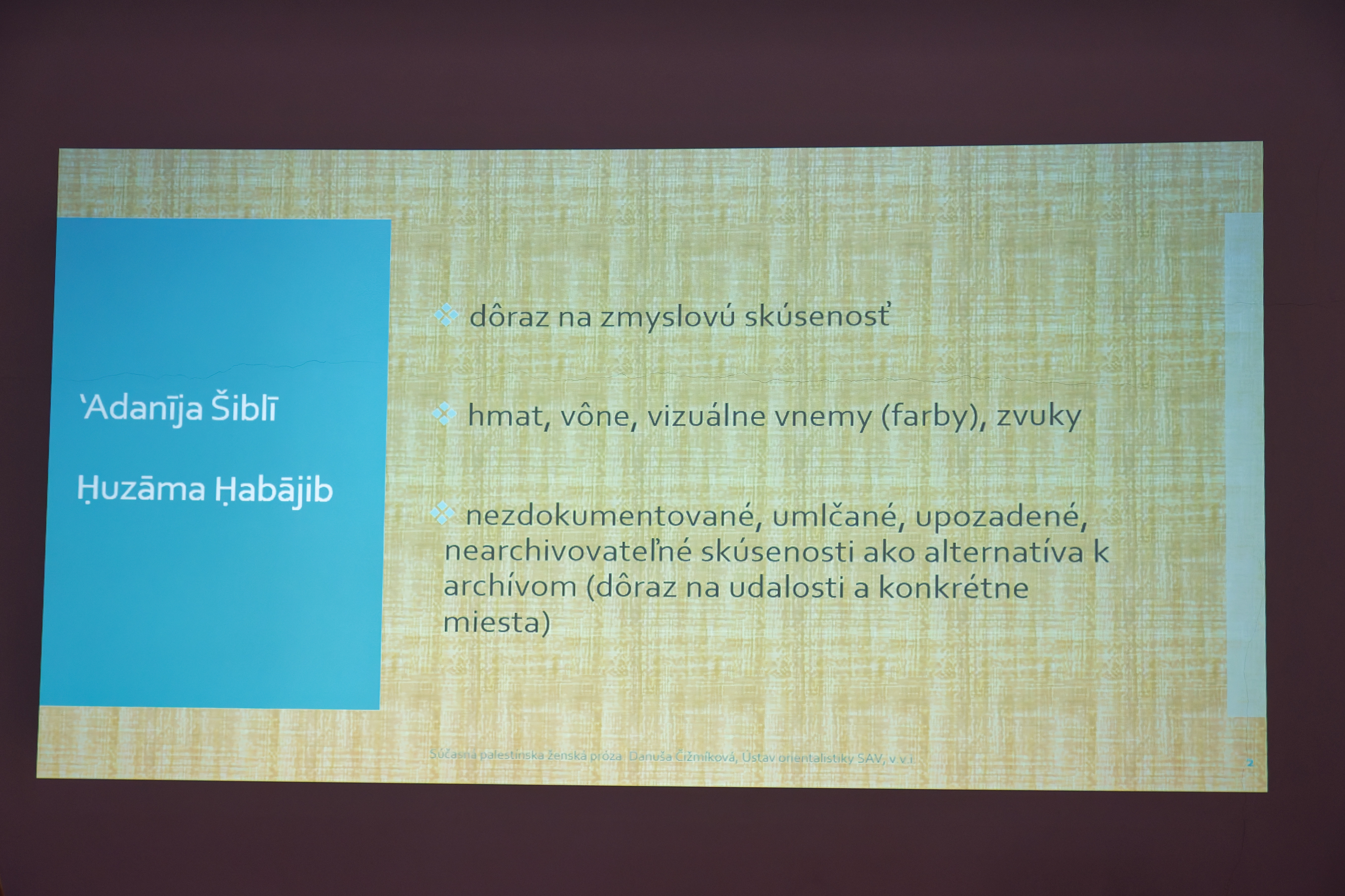 Prednáška, ktorá bola venovaná modernej a súčasnej palestínskej literatúre predstavila predovšetkým tvorbu žien a poukázala na spôsoby, akými palestínske autorky vyobrazujú skúsenosť palestínskej spoločnosti v kontexte dlhotrvajúceho palestínsko-izraelského konfliktu a izraelskej okupácie. Súčasťou prednášky bolo aj čítanie úryvkov z diel palestínskych autoriek v slovenskom preklade.