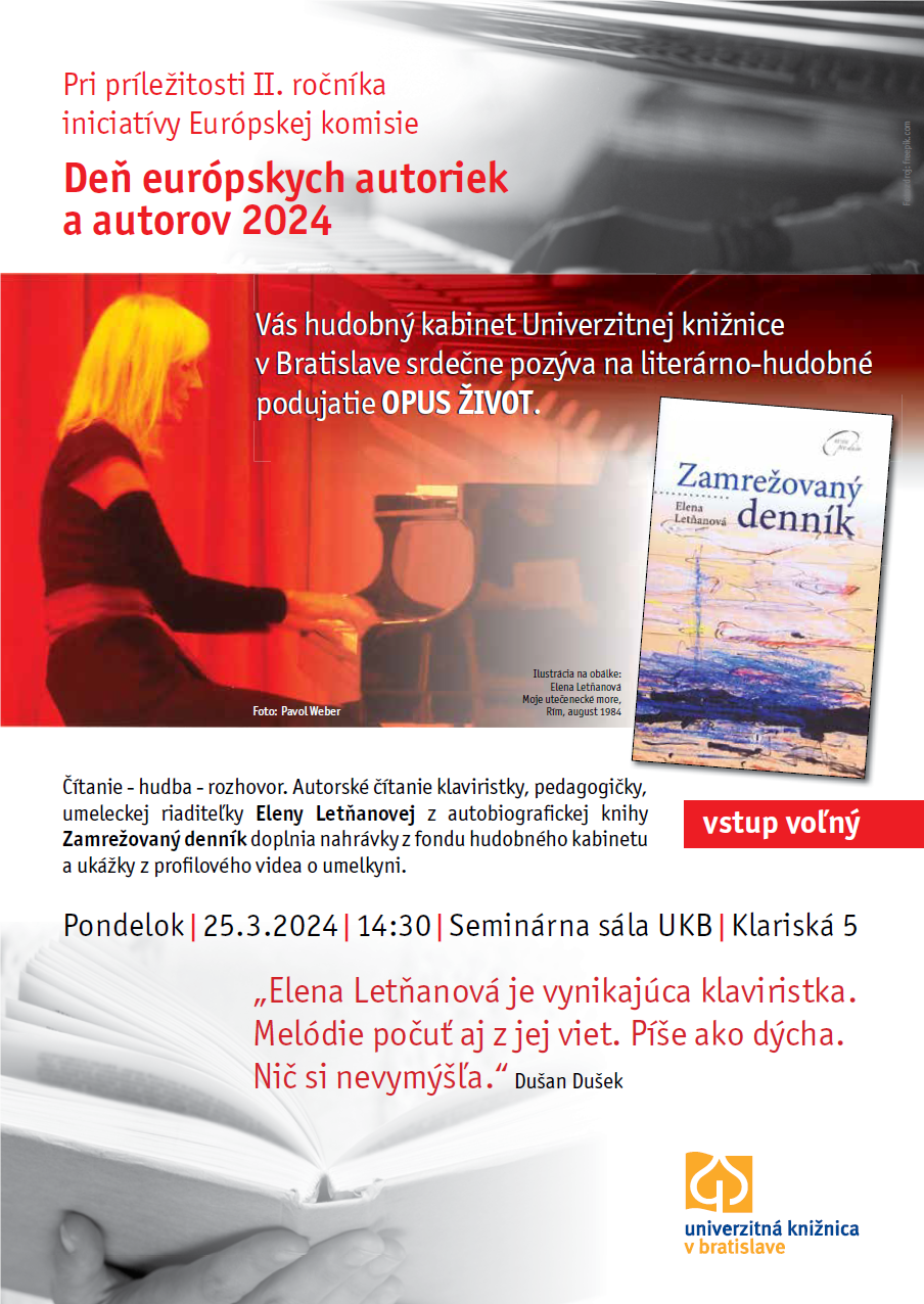 V pondelok 25. 3. 2024 sa uskutočnilo výnimočné podujatie vymykajúce sa z rámca kultúrnych aktivít hudobného kabinetu UKB. Na základe výzvy Ministerstva kultúry Slovenskej republiky zapojiť sa do Dňa európskych autoriek a autorov hudobný kabinet pripravil autorské čítanie Opus život z knihy Eleny Letňanovej Zamrežovaný denník. Čítanie bolo (neplánovane) doplnené úvodným klavírnym prednesom Chopinovej skladby Elenou Letňanovou. Vďaka tejto spontánnosti pani Letňanovej zaznela v priestoroch Klarisea špičková interpretácia v podaní slovenskej klaviristky svetového renomé. Podujatie pokračovalo autorským čítaním, hudobnými ukážkami z nahrávok Eleny Letňanovej a besedou s návštevníkmi.